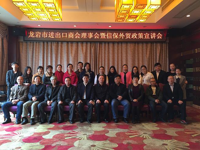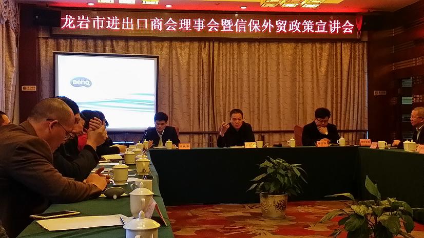 龙岩市进出口商会2016年理事会议暨信保外贸政策宣讲会3月 21日在龙岩新罗区召开, 会议首先由进出口商会秘书处报告了商会2015所做的各项工作,并对2016年的工作提出新目标和新重点;商会秘书处希望各会员企业一如既往地支持商会工作,加深和商会的联系和沟通,团结一致应对各种困难,在市商务局的正确领导下,在会长的带领下,以与时俱进的思想观念,奋发有为的精神状态,求实高效的工作作风,为实现全市外经贸的稳定发展、创新发展做出新的贡献!